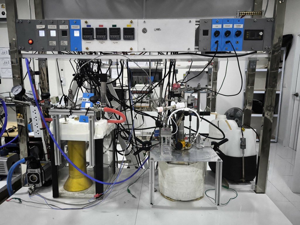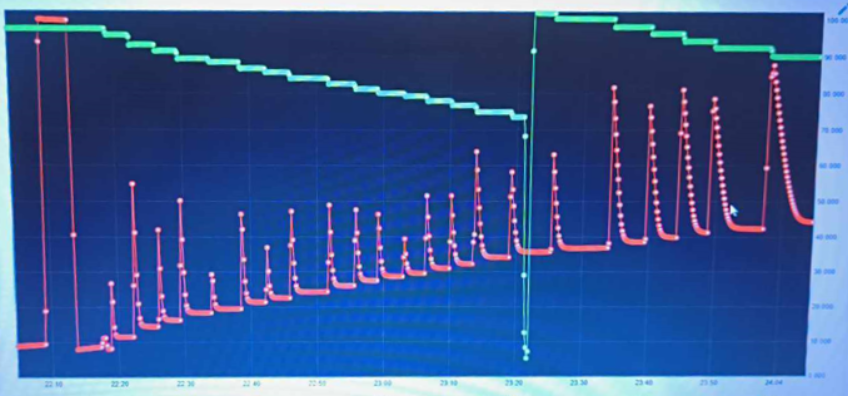 The photo below shows a complete measurement. The red curve represents the equilibrium cell pressure and the green curve the pressure in the gas reservoir. Whenever gas is injected into the equilibrium cell the reservoir pressure declines and the cell pressure increases. At a certain point, the reservoir pressure is increased by loading it with gas from the tank. Degassing of the initial solvent charge is performed in-situ by repeated freezing-evacuation cycles.