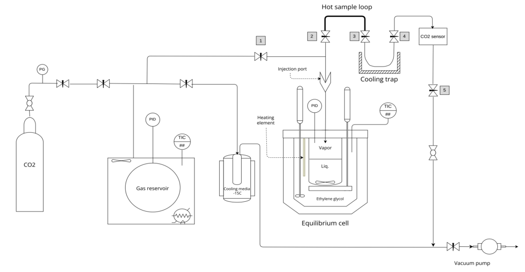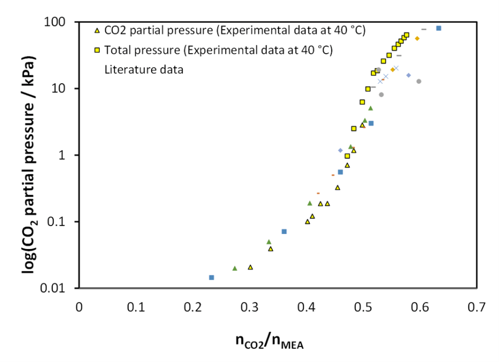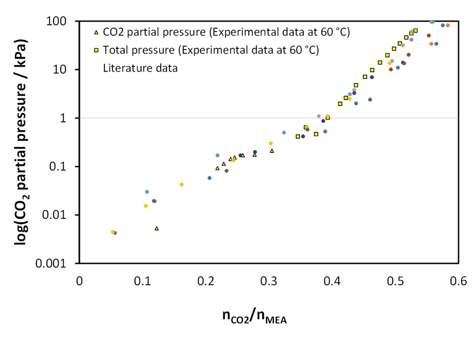 Using this equipment, several isotherms for the solubility of CO2 in 30 w% MEA-water were measured. The triangles are results of spectroscopic determination of CO2 in the vapor phase using an NDIR sensor.