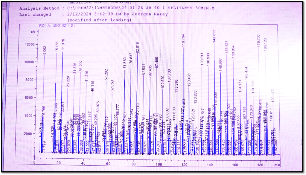 In all cases, samples are analyzed in a single GC run to save time. Each of the 12 sample is injected 3 times. Any trend in the 3 measurements would point to possible non-equilibrium state in the cell. Technical hexane is a mixture of 5 different isomers, so in this case the resulting GC contains 216 component peaks: